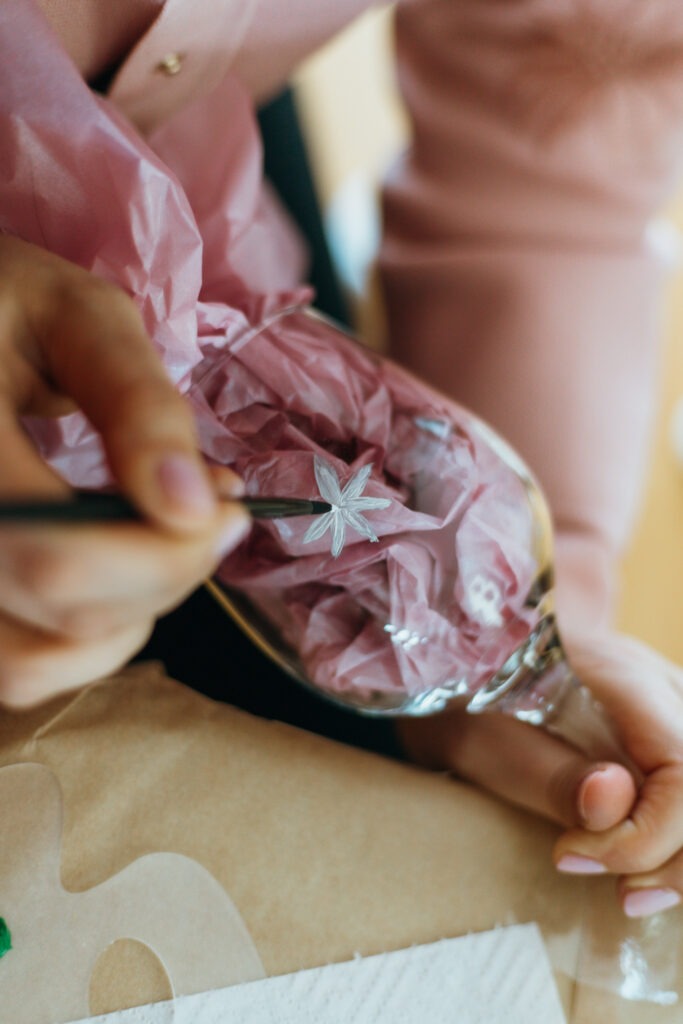 Väike nipp: pane klaasi sisse hele majapidamispaber – nii on hästi näha, kuidas joonistus klaasil välja paistab.