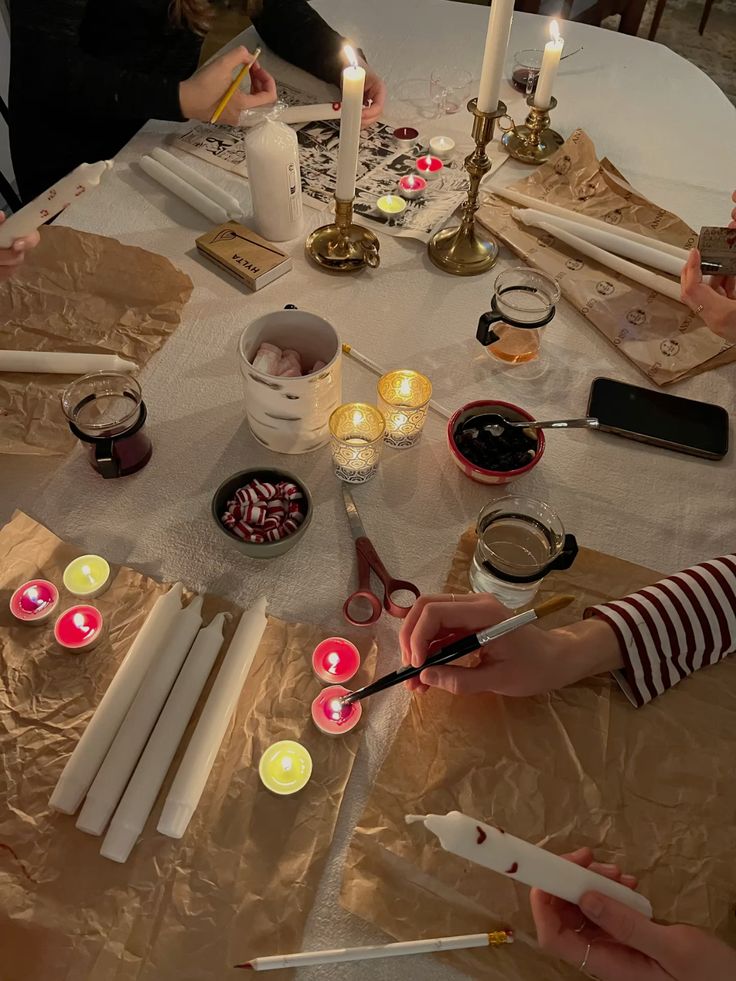 - Planeeri muster, võid mõned inspopildid ette printida või kasvõi varasemalt läbi joonistada. Kõige paremini toimivad kas abstraktsed või minimalistlikud sümbolid. Küünlavärviga võid värvida nii otse küünlale või kasutada pintsleid.